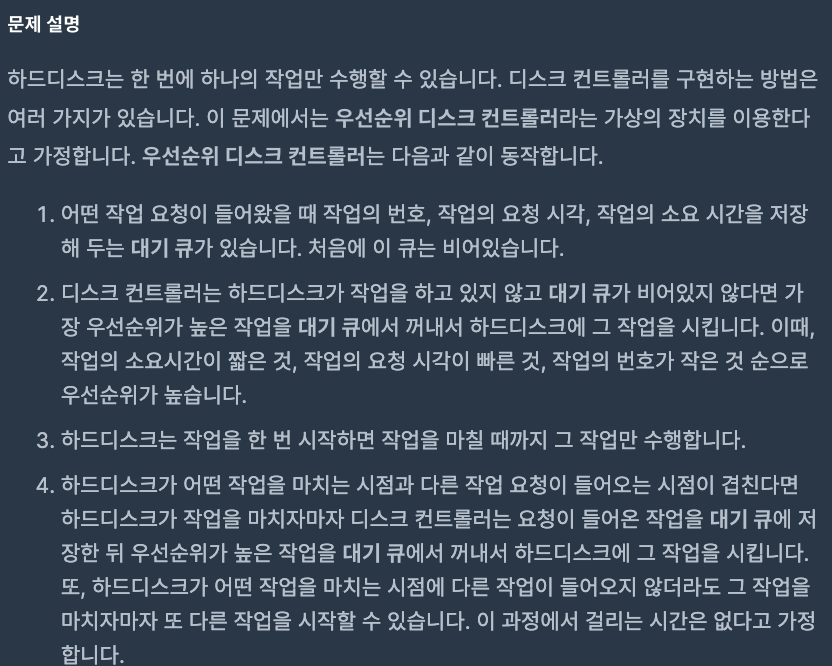 문제 설명에서 볼 수 있듯이 각 작업에 우선순위가 주어지고 이 우선순위(소요시간, 요청 시각)를 기반으로 작업을 처리해야한다. 작업 큐에서 매번 가장 작은 우선순위를 순회하며 찾을 순 없으니 힙(heap)을 사용하여 가장 작은 우선순위를 빠르게 찾을 수 있도록 해주었다. 또한 소요시간과 요청 시각이 같다면 작업의 번호가 작은 것을 우선순위로 본다고 했는데, 사실 소요시간과 요청 시각이 같다면 무엇을 먼저 처리하든 구하려는 정답에는 차이가 없기 때문에 제외하고 2가지만 고려해주었다.