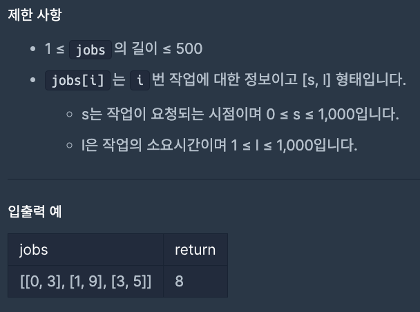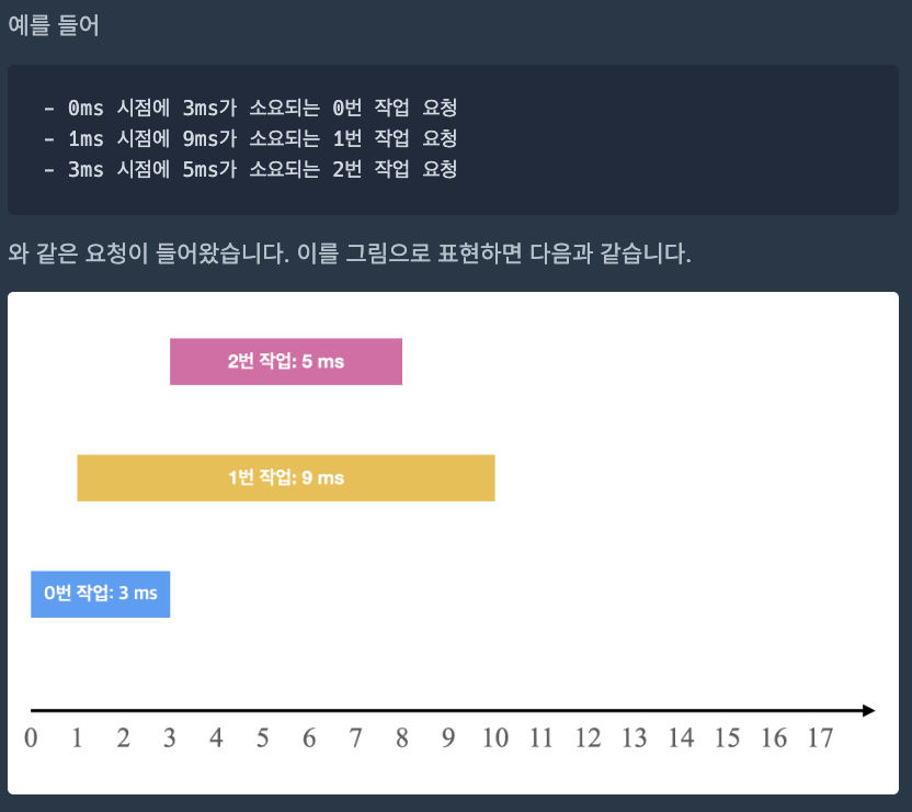 주어진 작업 큐에서 현재 시간보다 작은 시간의 작업들을 모두 힙에 넣고 힙이 비어있지 않다면 하나씩 꺼내서 작업을 처리해주었다.