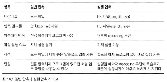 실행 파일(PE)을 대상으로 파일 내부에 압축 해제 코드를 포함하고 있어 실행되는 순간에 메모리에서 압축을 해제시킨 후 실행시키는 기술. 실행 압축된 파일 역시 PE파일이며 내부에 원본 PE파일과 decoding 루틴이 존재함. EP코드에 decoding 루틴이 실행되면서 메모리에서 압축을 해제시킨 후 실행됨.