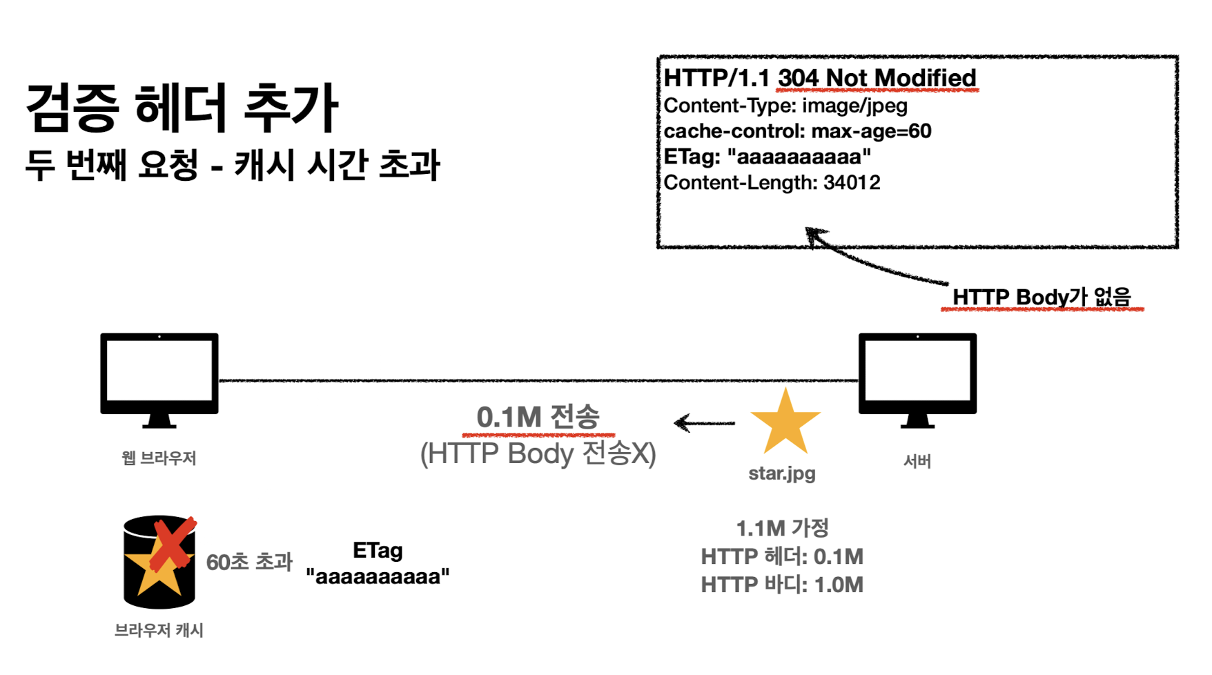 캐시가 만료되었더라도 헤더에 최종 수정일을 추가하여 검증할 수 있다. 이때 응답은 헤더만 반환!