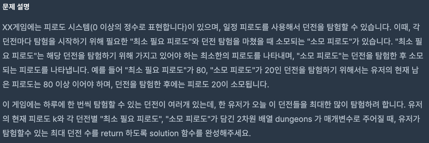 하지만 던전을 소모 피로도, 요구 피로도 어떤 걸 기준으로 정렬해도 최적을 보장하기 힘들다는 생각에 완전탐색으로 풀이하게 되었다.