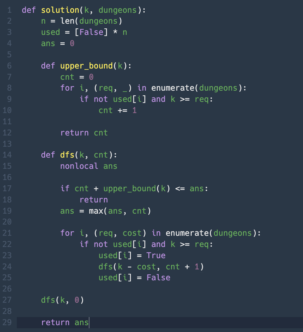 upper_bound(k)는 “비용을 0이라고 가정하고, 지금 k로 요구치(req)만 충족하는 남은 던전 수”를 센다. 비용을 무시하므로 실제보다 많게 잡는다. 가지치기해도 최적해를 보장하기 위해 낙관적으로 잡았다.