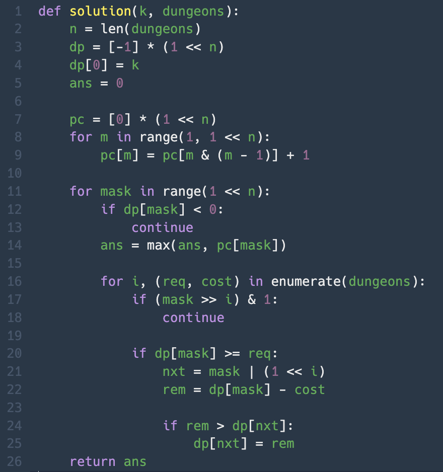 2. 현재 남은 피로도 dp[mask]가 이 던전 요구치 req 이상이면 입장 가능