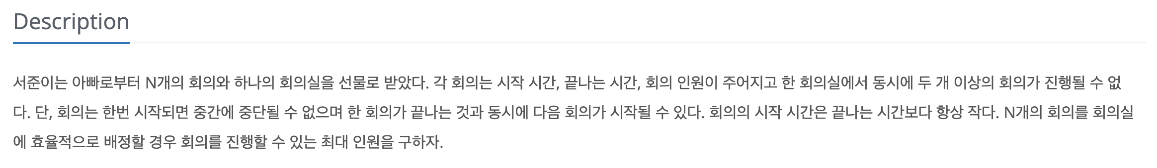 문제를 잘 읽어보면 제한사항에 k번째 회의는 k-1, k+1과 겹치지만 다른 회의랑은 겹치지 않는다는 것을 알 수 있다. 해당 조건으로 회의의 시작 시간, 종료 시간은 필요가 없어지는 정보가 된다. 핵심은 인접한 것을 선택하지 못한다는 것이다.