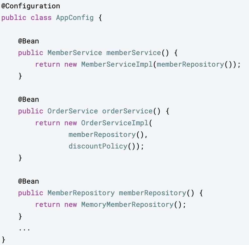 그럼 빈을 설정하는 파일은 다음과 같이 정리할 수 있다. @Configuration 클래스는 CGLIB으로 프록시되어 @Bean 메서드 여러 번 호출해도 같은 싱글톤을 반환(중복 생성 방지)