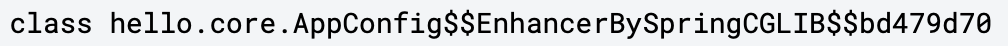 원래라면 Appconfig 라는 단일 클래스로 나와야하는데 뒤에 뭔가 달려서 나온다. 이게 바로 CGLIB을 이용해서 우리가 만든 설정 파일을 상속하는 임의의 프록시 객체를 빈으로 등록한다. 내부 코드를 다음과 같이 간단하게 예상해볼 수 있다.