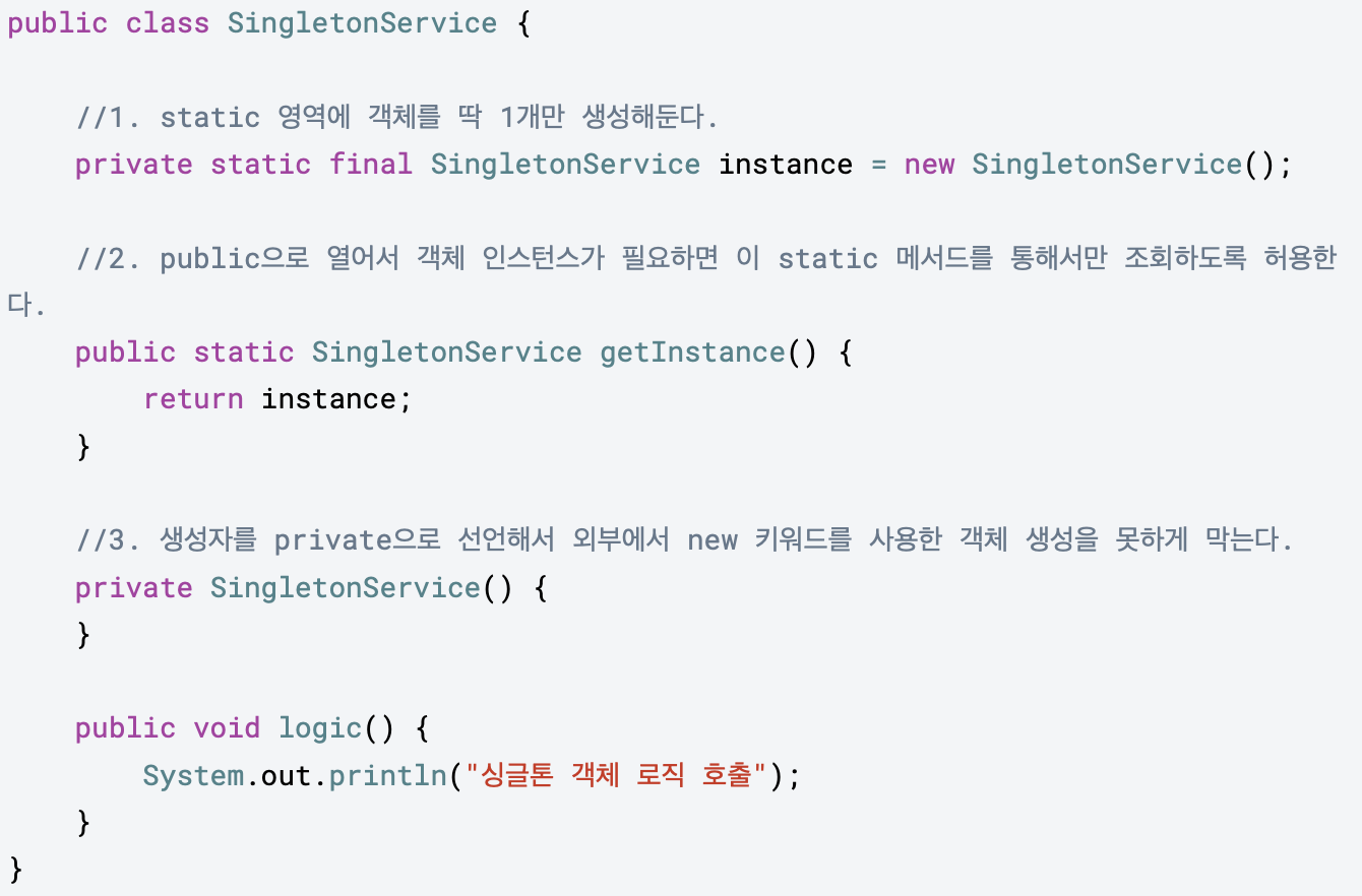 만약 이 객체의 인스턴스가 필요하다면 생성자는 private로 만들어 새로운 객체 생성을 막고 오직 getInstance()를 호출해서 사용하도록 강제하면 싱글톤의 완성이다.