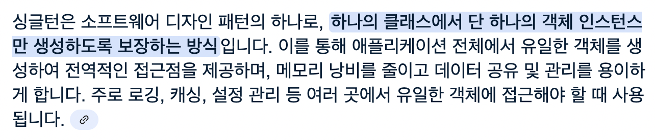싱글톤이란 하나의 클래스에서 단 하나의 객체 인스턴스만 생성하도록 보장하는 디자인 패턴이다.