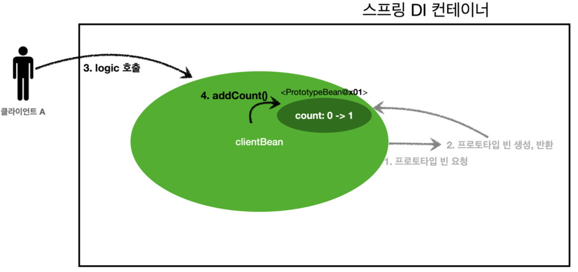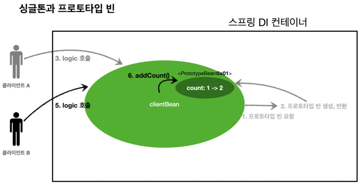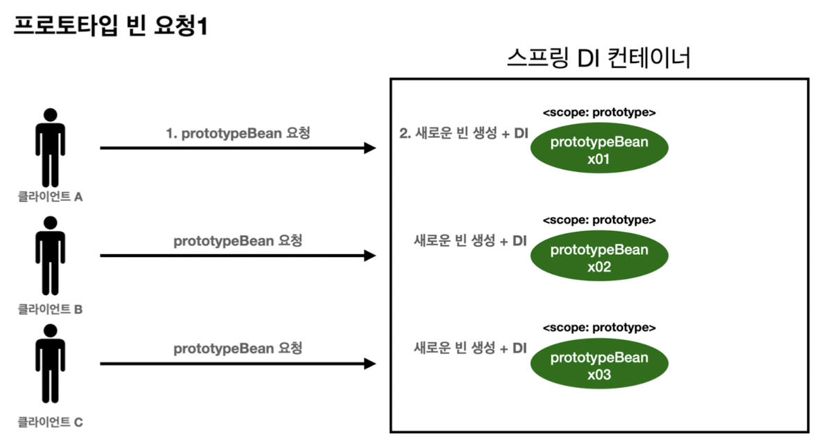 위 그림처럼 싱글톤 스코프의 빈은 컨테이너가 올라가고 생성된 단 하나의 빈으로 모든 요청을 처리하지만 프로토타입 빈은 컨테이너에 “요청할 때마다(getBean 호출마다)” 새 인스턴스를 생성한다. 여기서 핵심은 컨테이너는 프로토타입 스코프의 빈을 생성하고 의존관계 주입, 초기화까지만 처리한다는 것이다. 이후 컨테이너는 생성된 프로토타입 빈을 관리하지 않는다. 프로토타입 빈을 관리할 책임을 해당 빈을 받은 클라이언트에게 있기 때문에 @PreDestroy와 같은 소멸자가 호출되지 않는다. 소멸자와 같은 종료 메서드의 호출도 클라이언트가 직접 해야한다.