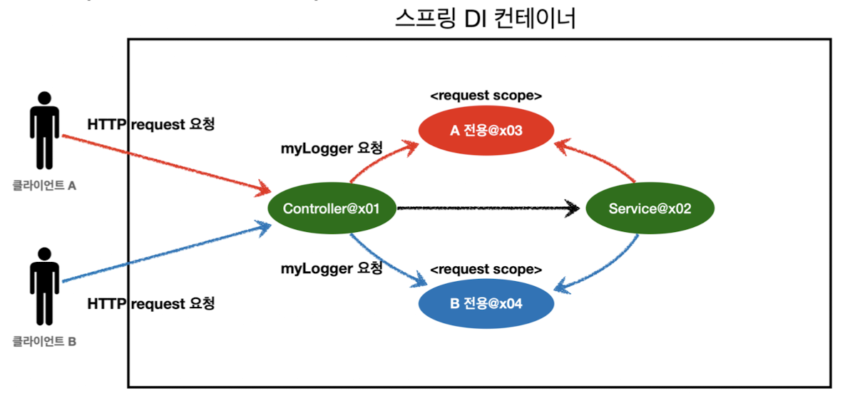 프록시 객체 덕분에 클라이언트는 마치 싱글톤 빈을 사용하듯이 request scope를 사용할 수 있다. 사실 provider와 proxy 모두 실제 사용 시점까지 빈의 생성을 늦추는 것이다.
