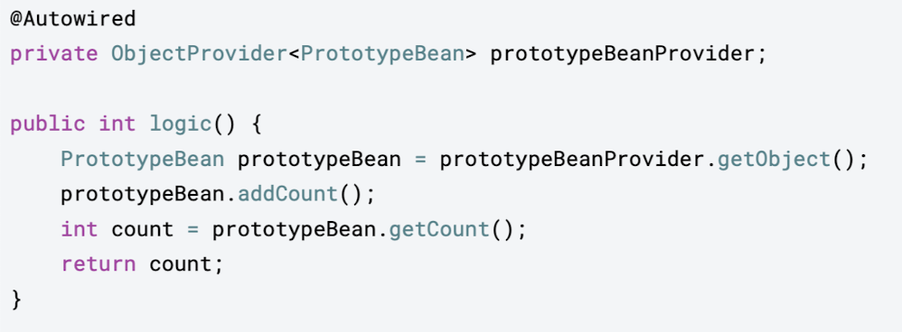 해당 문제를 해결하기 위해서는 로직이 호출될 때마다 컨테이너에 새로운 빈을 요청하면 된다. 사실 스프링의 ApplicatoinContext를 직접 주입받아 로직이 호출되면 컨테이너에서 getBean(원하는 Bean)을 하는 방법도 있다. 하지만 이 방법은 컨테이너에 종속적인 코드가 되고 단위 테스트도 어려워진다. 우리는 컨테이너에서 필요한 의존성을 찾는(Dependency Lookup) 수준의 기능만 필요하다. Provider가 그 역할을 수행해준다.