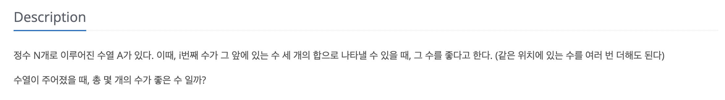 문제가 굉장히 간단명료하다. 부연설명해보자면 수열에서 Ai 이전의 3개 숫자를 합해서 Ai를 만들 수 있다면 Ai는 좋은 수이다.(예제 똑바로 안 보고 바로 앞 3개로 풀이하다가 시간낭비한 사람...) 추가적으로 같은 값을 여러 번 써도 된다(인덱스 중복 허용) -> v+v+v, v+v+z 같은 조합도 가능.