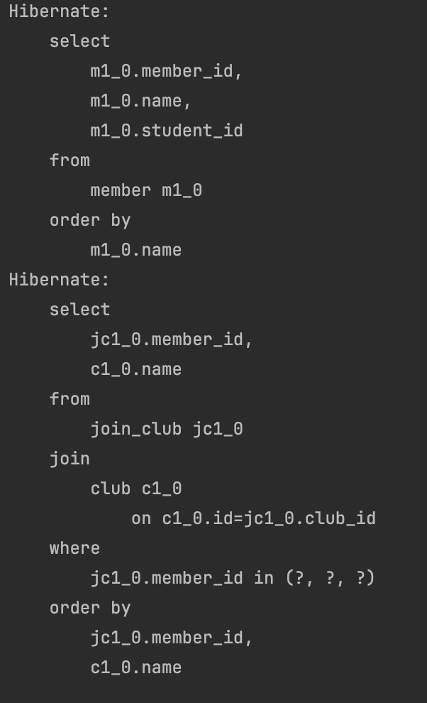 처음 코드를 작성할 땐 Data JPA를 사용할 줄 몰랐기에 직접 EntityManager로 쿼리를 작성했었다. 모든 학생의 가입된 동아리 정보를 조회하기 위해 모든 멤버에서 필요한 정보를 뽑고 멤버 id를 순회하며 멤버의 동아리를 모두 조회하는 메서드를 작성했었다. 그때는 이게 N+1인지 모르고 작성했었다... 이렇게 하는 것이 중복된 행 없이 조회하는 최선인 줄 알았지만... 이제 N+1 문제가 무엇인지 알았으니 개선해보자.