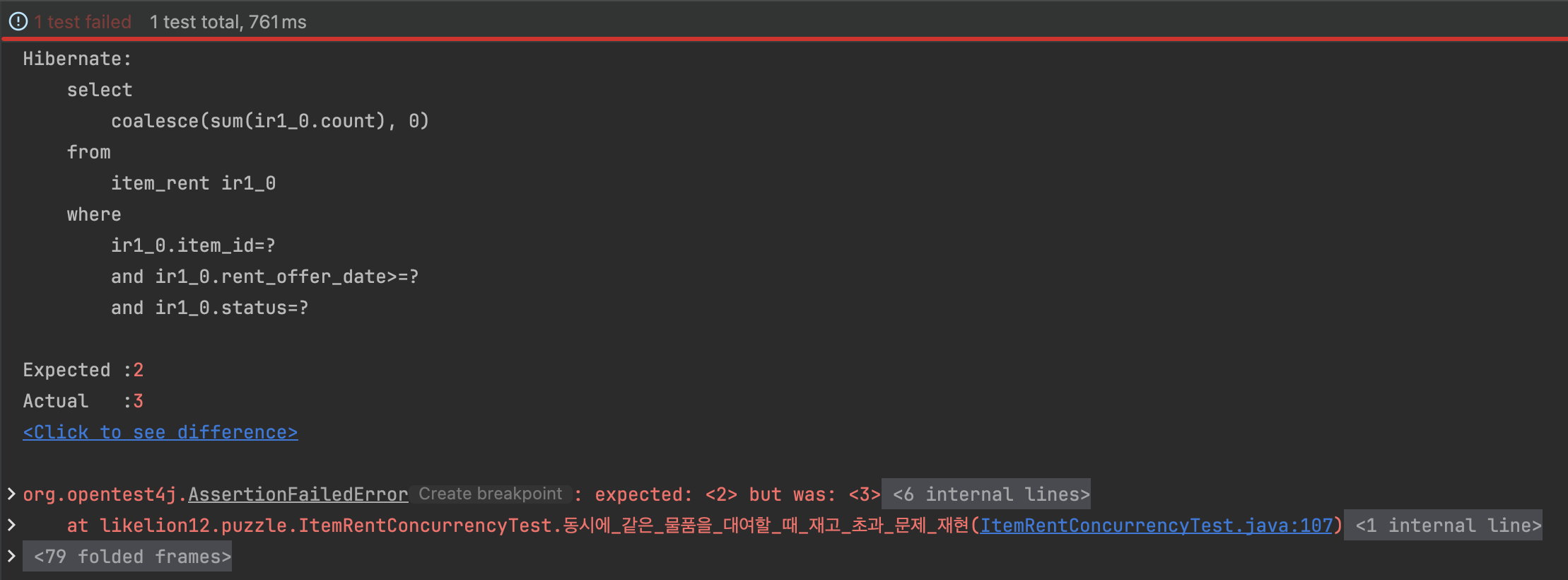 Thread 3개를 동시에 실행하여 3명이서 현재 재고가 2개인 물품에 동시에 신청하는 테스트를 구성했다. 2개가 예약되는 것을 조건으로 걸고 테스트를 진행했는데 사실 여기서 정말 바보같은 실수를 했다..(다행히 문제 상황을 확인하는데에는 지장이 없었지만... 아래에서 수정했습니다,,)