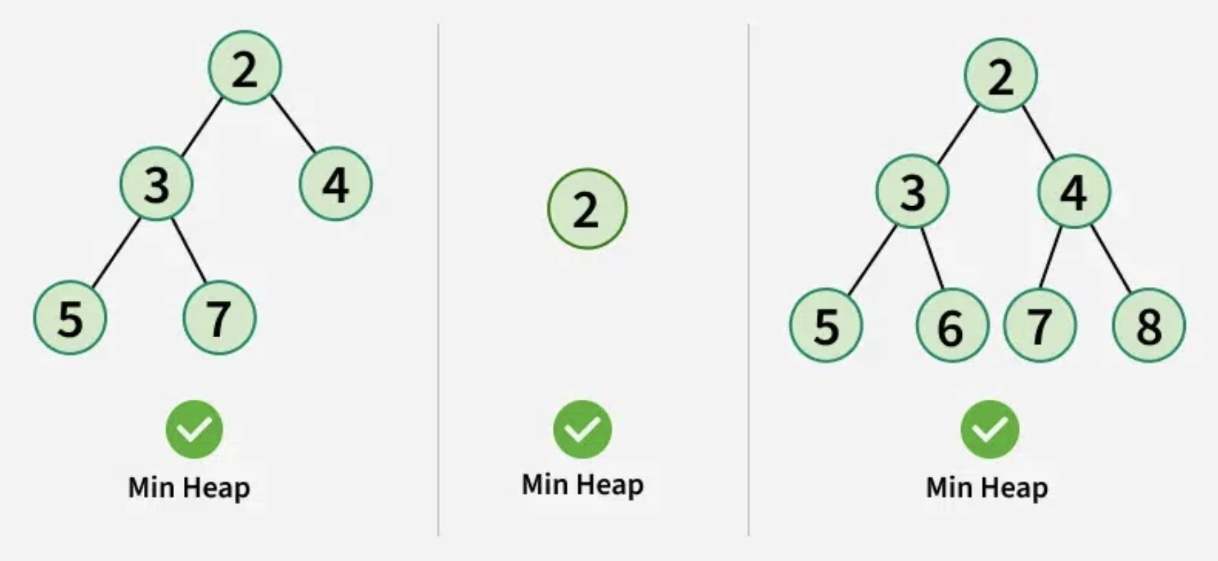 최소 힙: 가장 작은 값이 항상 루트 노드에 있으며 모든 노드에서 부모는 자식보다 작거나 같다.