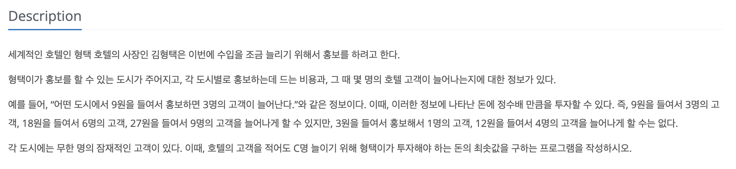 문제 요약은 다음과 같다. 각 도시에서 광고에 cost원을 쓰면 people명의 고객을 얻는다. 최소 C명 이상의 고객을 모으기 위해 써야 하는 최소 비용을 구하라. 같은 도시는 여러 번 사용할 수 있다.