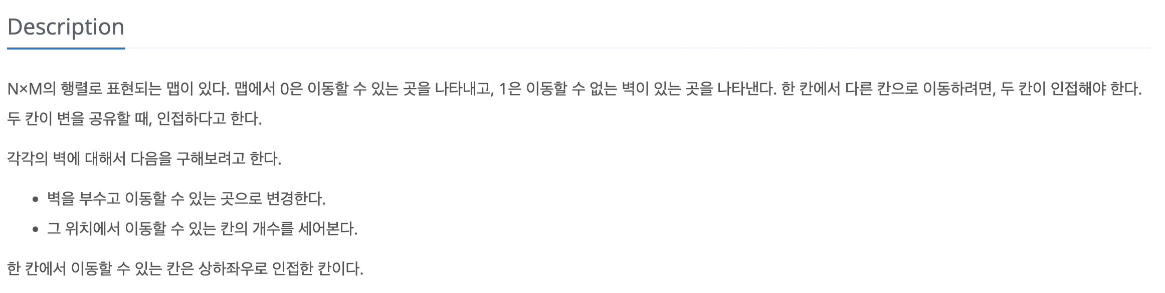 문제를 요약해보자면, 벽이 있는 위치에서 시작해서 시작 위치의 벽이 부숴졌을 때 이동할 수 있는 공간의 넓이를 계산하는 문제이다. 사실 별 생각 없이 n, m이 1000이라서 모든 위치를 start 배열에 넣고 bfs를 돌렸다가 시원하게 시간초과 받았다...