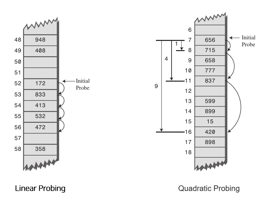- 이차 탐사(Quadratic Probing): index + 1 ^ 2, 2 ^ 2, ... 로 제곱하여 빈 칸을 탐색하는 방법이다.