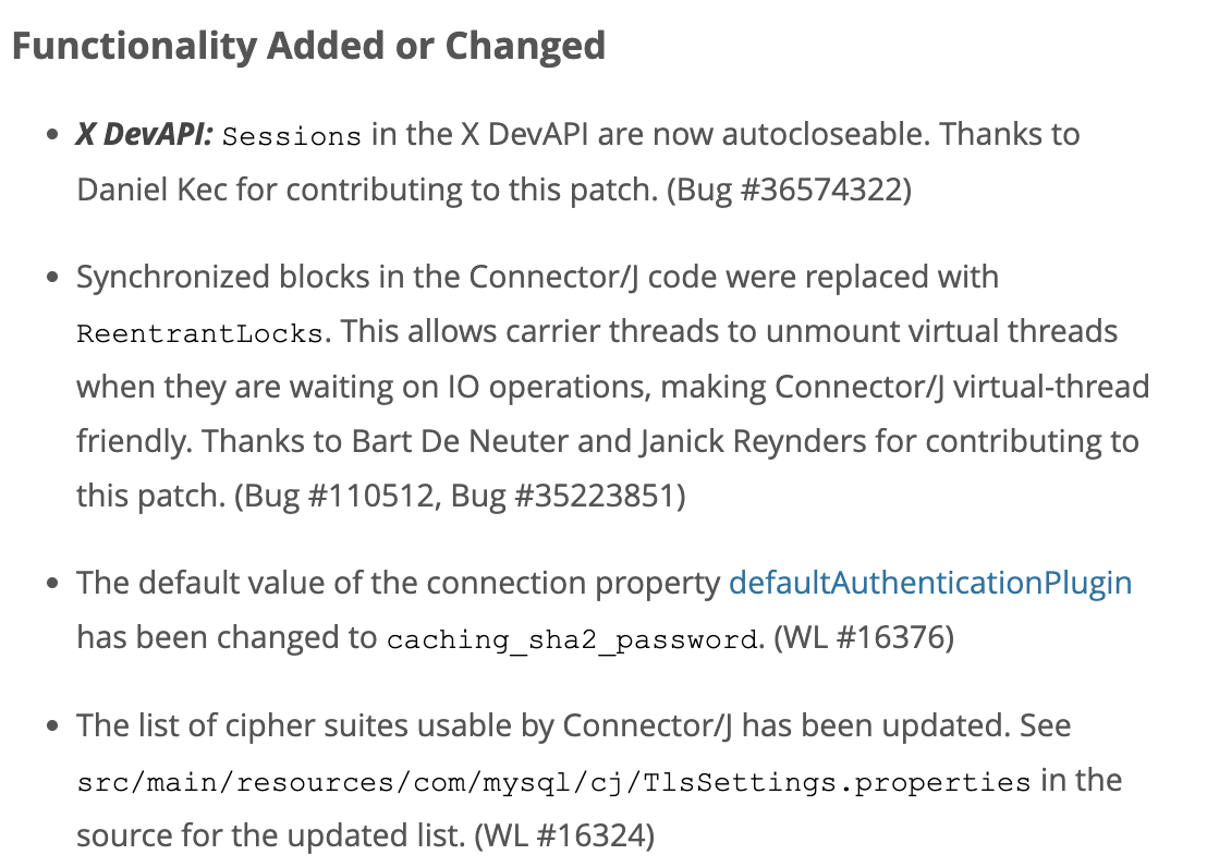 단순히 코드를 작성할 때 Synchronized 키워드만 조심하는 것이 아닌 외부 의존성에 Synchronized 구현이 있는 경우도 조심해야한다. 실제로 많이 사용되는 MySQL 기반 JDBC 드라이버인 Connector-J 8.x버전은 synchronized 구현이 있어 이슈가 있었다. 이후 MySQL 쪽에서 인지하고 Connector-J 9.0.0 버전 릴리즈노트에 "Synchronized를 ReentrantLock으로 변경하여 VT-friendly하게 수정했다"라고 명시되어있다. 하지만 모든 Synchronized를 없앤게 아닌 몇몇 I/O 경로에서의 구현을 바꾼 것이기 때문에 사용할 때 "VT를 효율적으로 사용할 수 있는 구간인가?"를 잘 판단하는 것이 중요할 것 같다. 이건 단순히 MySQL뿐의 문제가 아니라 사용할 때 "외부 의존성이 Synchronized 구현을 사용하는가?", "이 구간에서 pin 현상이 발생하는가?"를 잘 파악해야 올바르게 사용할 수 있다.