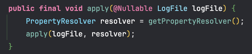총 세 개의 파라미터를 가지고 있지만 실제로는 logFile을 제외하고 두 개의 인자만 넘어온다. 그 중 overrides는 위에서 살펴봤던 것처럼 logging.log4j2.config.override를 지원하는 내용이기 때문에 슬쩍 넘어가보자.