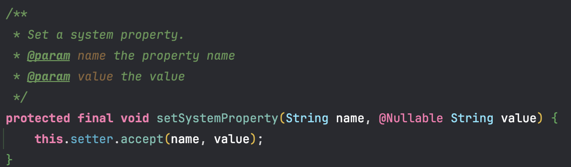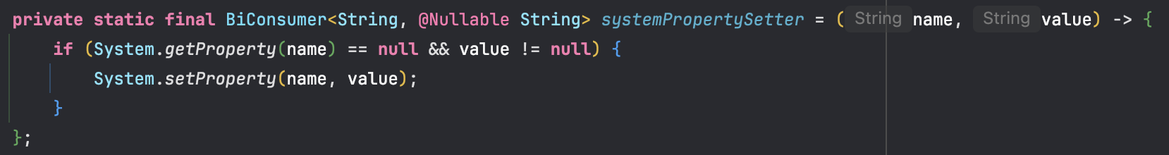 세 번째 생성자 인자인 setter는 시스템 프로퍼티를 어떻게 기록할지를 제어하는 BiConsumer<String, String>이다. “이름과 값”을 어디에, 어떻게 기록할지 결정하는 함수이다. 기본적으로 null이 넘어가는데, 이 경우엔 시스템 프로퍼티에 값을 작성하게 된다. setSystemProperty가 호출될 때 실행되어 시스템 프로퍼티에 값을 작성한다. 키가 아직 시스템 프로퍼티에 설정되지 않았고, 넣을 값이 있을 때만 System.setProperty(name, value)로 기록한다.