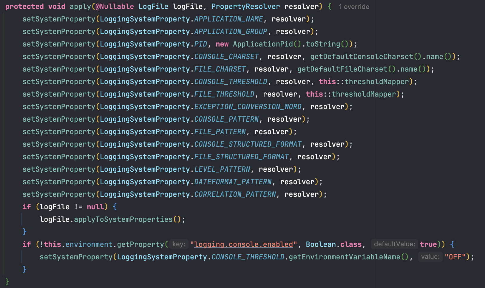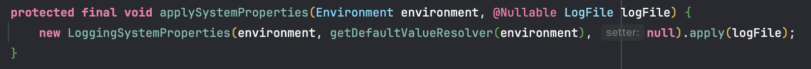 먼저 간략하게 설명하자면 메서드 네이밍처럼 application.properties(yml)에 정의된 로깅 관련 속성들을 시스템 프로퍼티로 변환하여 설정한다.