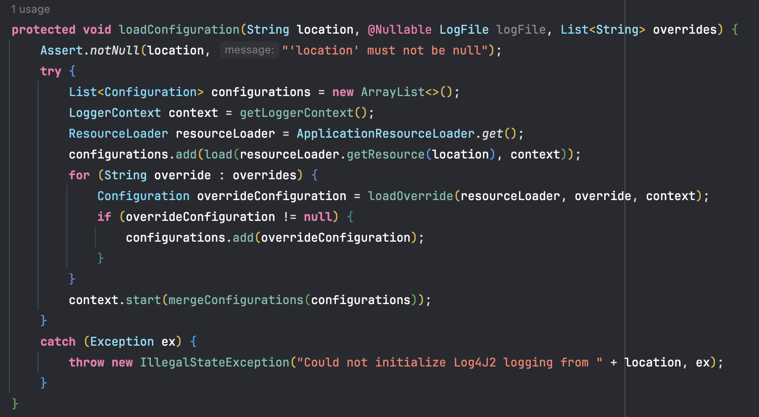 여기까지 확인해봤는데, getOverrides() 메서드는 우리가 찾는 진입점과는 좀 다른 성격이라는 것을 눈치챌 수 있다! 사실 이 메서드는 Log4J2에서 logging.log4j2.config.override 기능을 사용하는 경우를 지원하기 위한 메서드이다. 그렇다면 다음 단계로 넘어가보자.