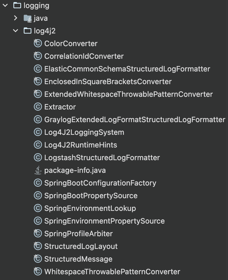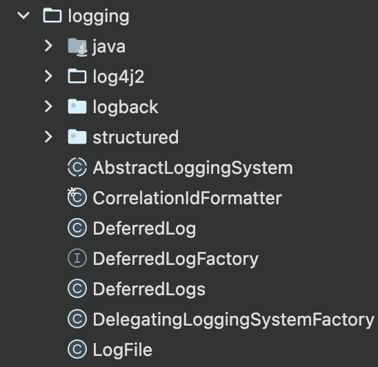 Logging 관련 클래스들은 core/spring-boot/java/org/springframework/boot/logging 내부에서 찾을 수 있었다.(사실 작업하는 도중에 Spring Boot에서 패키지 관련 리팩토링이 있었는지 변경돼서 조금 헤맸다....)