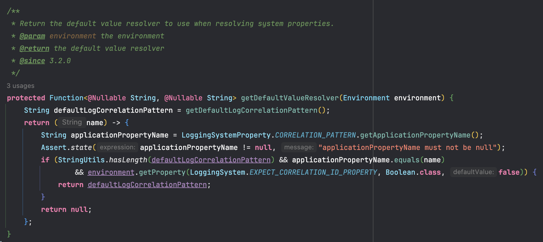 여기서 두 번째 생성자 인자로 넘어가는 getDefaultValueResolver는 LoggingSystemProperty.CORRELATION_PATTERN 하나만 처리한다. 람다 내부에서 correlation pattern 프로퍼티인지 확인한 뒤, 속성에 logging.expect-correlation-id가 true로 설정되어 있을 때만 getDefaultLogCorrelationPattern() 값(Log4j2에서는 %correlationId)을 반환하고, 나머지는 모두 null을 반환한다. 다른 기본값은 주입하지 않으니 크게 신경쓰지 않아도 된다.