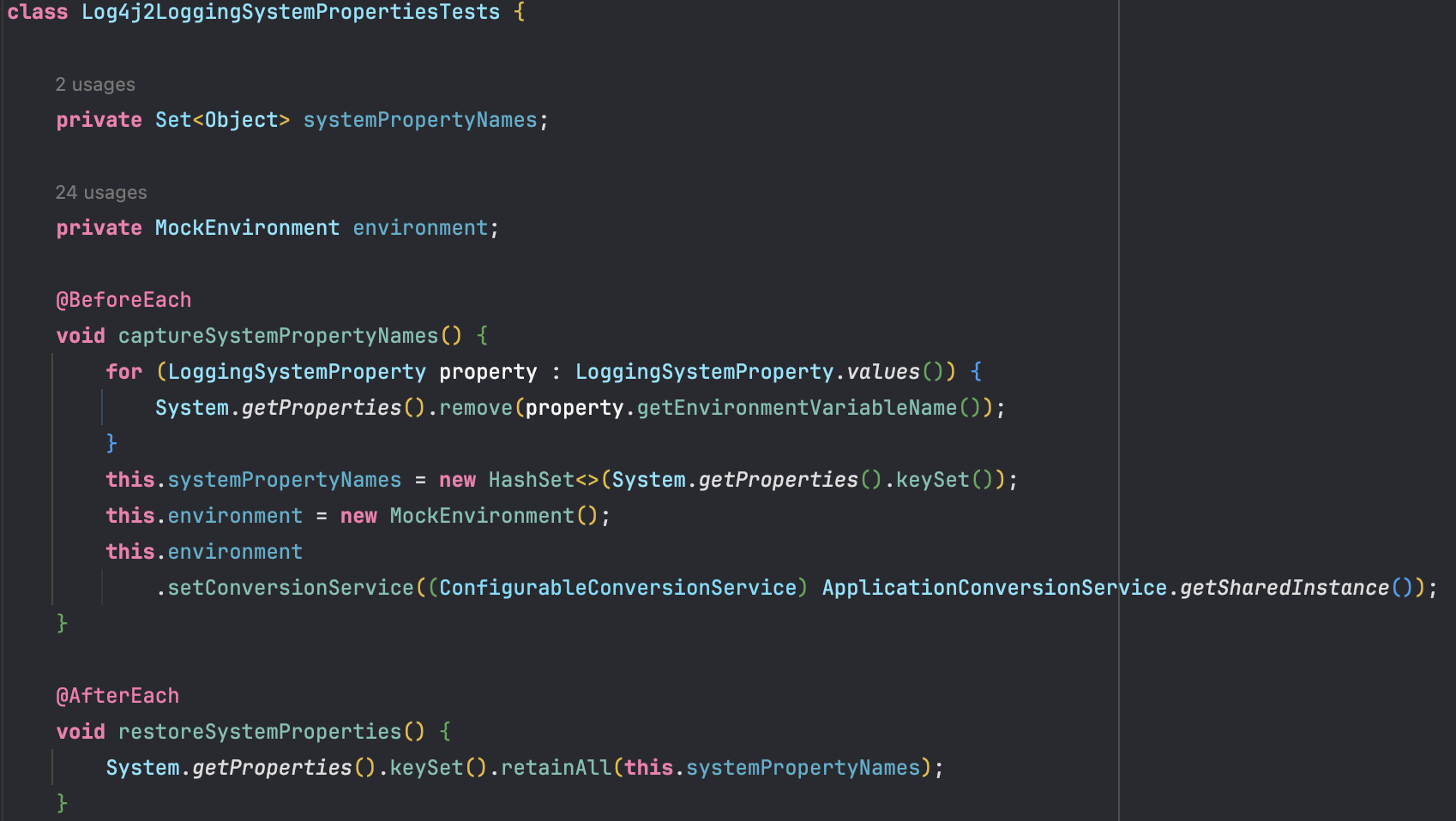 getLoggingSystemProperties를 호출할 때 현재 LoggingSystem에 저장된 클래스의 SystemProperties를 가져오는데, 기존엔 Log4j2 전용 프로퍼티가 없었기 때문에 getSystemProperties를 따로 오버라이드하지 않고 공통 시스템 프로퍼티만 불러왔었다. 하지만 이제 Log4j2 전용 프로퍼티를 설정해주었기 때문에 오버라이드해서 프로퍼티를 끼워넣어주도록 했다.