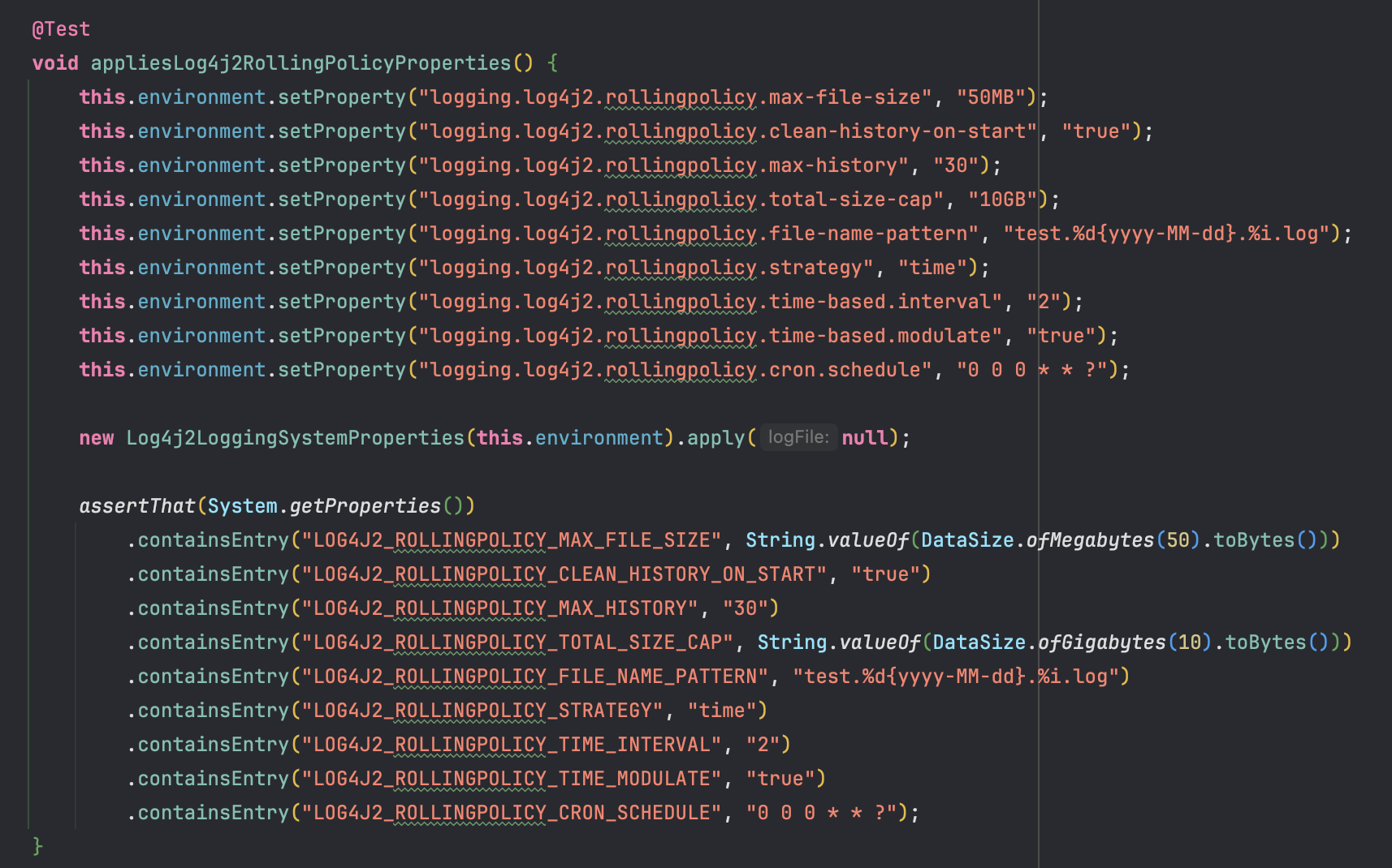 각 테스트는 MockEnvironment로 입력 값을 주입하고, 실제 System.setProperty 경로를 통해 LOG4J2_ROLLINGPOLICY_* 시스템 프로퍼티가 설정되는지 검증한다. 전역 상태 격리를 위해 매 테스트 전/후에 시스템 프로퍼티를 스냅샷/복원하는 과정을 추가해주었다.