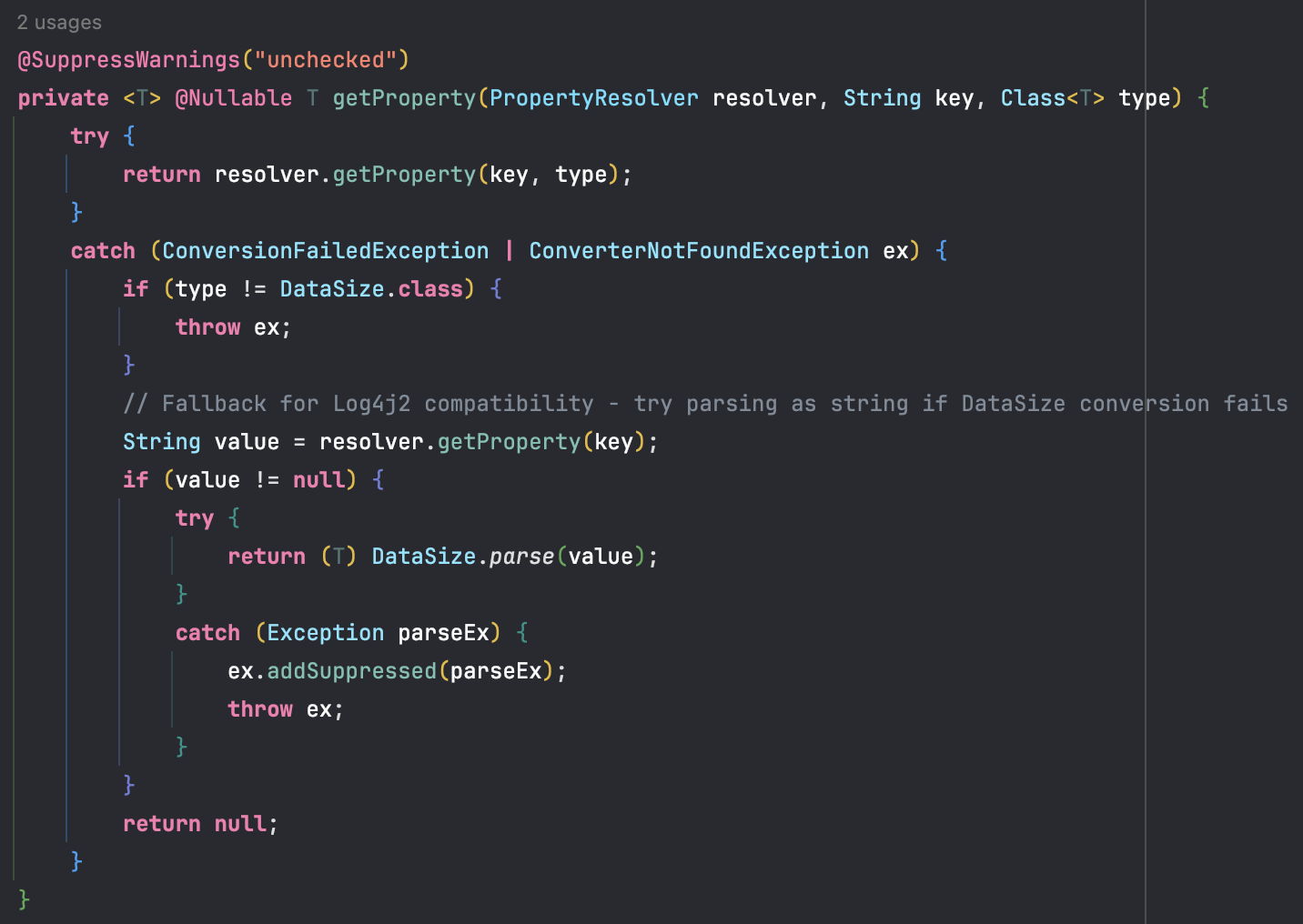 @SuppressWarnings는 컴파일러 경고를 특정 지점에서 숨기기 위한 애노테이션이다. 실제 동작에는 영향이 없고, 경고만 억제한다. 여기서는 제네릭 미검사 캐스트 경고를 숨기기 위해서 사용한 것으로 추측된다. getProperty는 제네릭 반환형 <T>를 갖는데, DataSize 처리에서 DataSize.parse(), DataSize.ofBytes()처럼 컴파일러가 타입 안정성을 증명할 수 없는 캐스트가 발생하게 된다. 하지만 해당 캐스트는 실제론 type == DataSize.class일 때만 실행되므로 런타임 상 안전한데, 이때 “unchecked” 경고를 억제하려고 @SuppressWarnings("unchecked")를 붙인다.