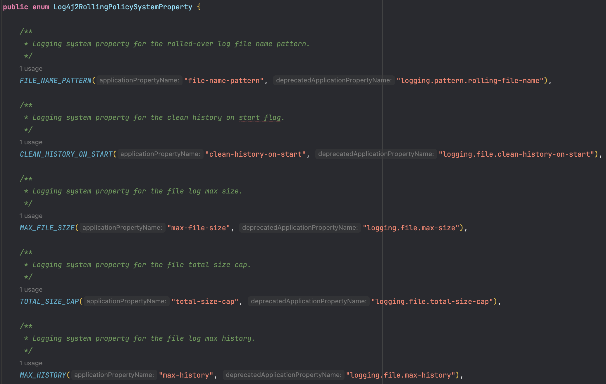 그래서 일단 새로운 프로퍼티를 Log4j2RollingPolicySystemProperty라는 enum으로 정의해주었다.