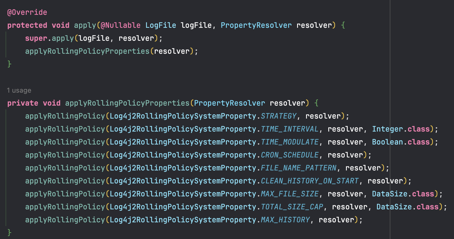 지난 번엔 기존 Spring Boot의 Logging 관련 설정들이 어떻게 적용되는지 알아보았다. 이제 그 흐름 사이에 추가하려고 하는 Log4J2의 Rolling Policy 속성들을 읽을 수 있도록 끼워넣으면 된다! 직접 구현한 내용에 대해 회고 및 자가 피드백할 겸 남겨두려고 한다.