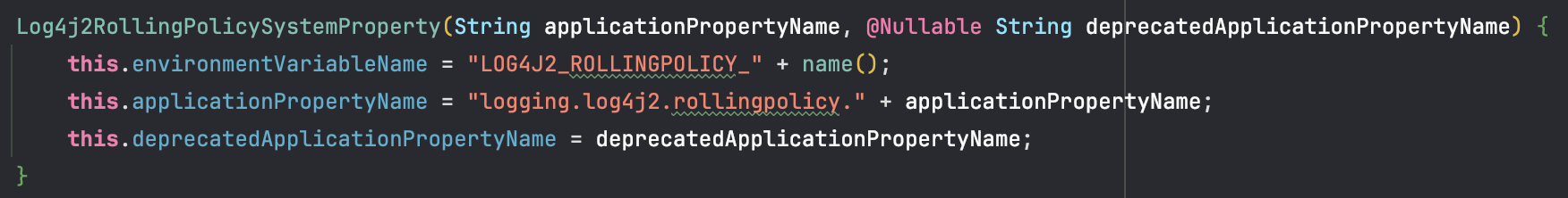 이전 글에서 확인한것과 같이 Logging을 위한 기본적인 Property는 LoggingSystemProperty에 작성되어있다. 근데 Logback은 RollingPolicySystemProperty라는 enum으로 Rolling Policy 속성이 정의되어있는데, Log4J2에는 이런 정의가 없다!