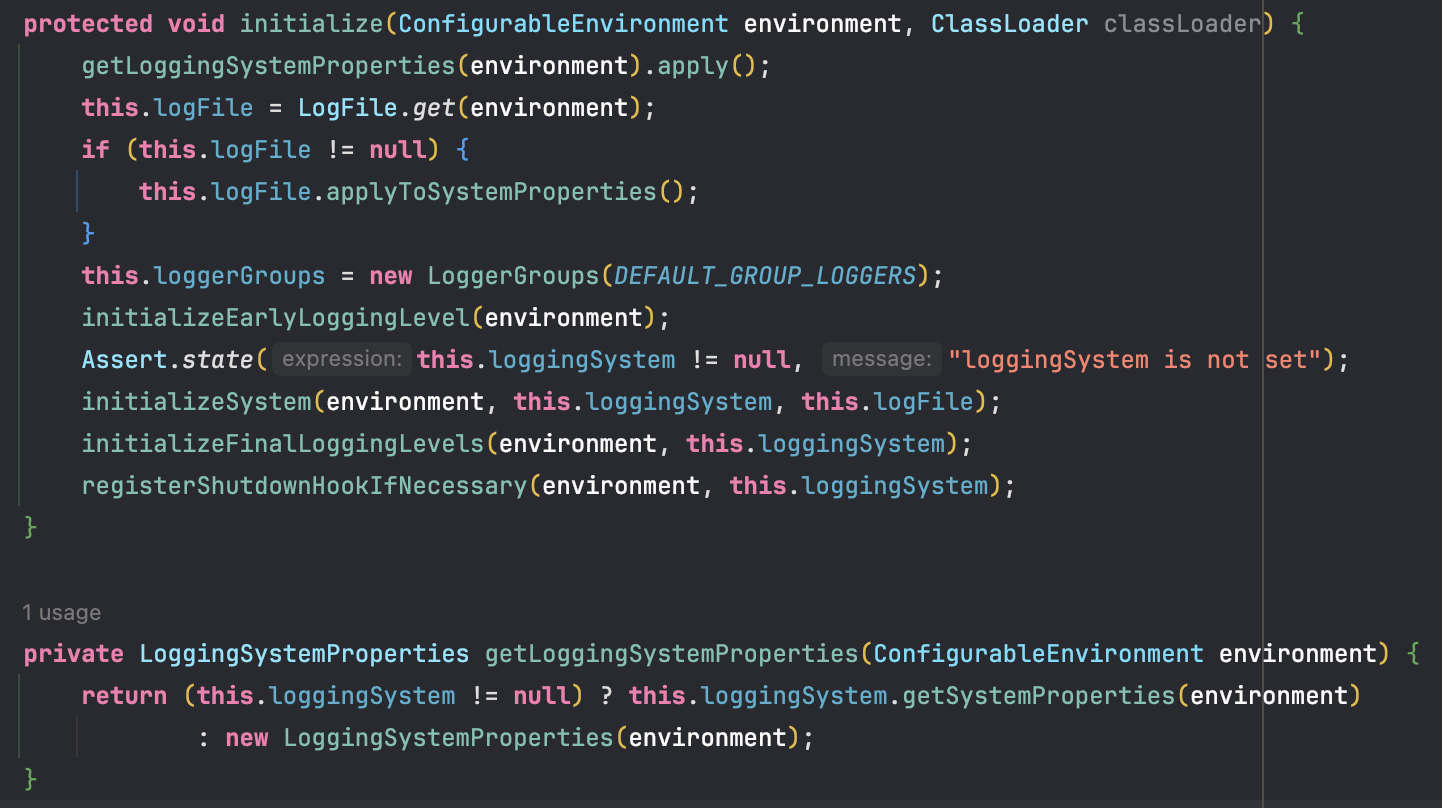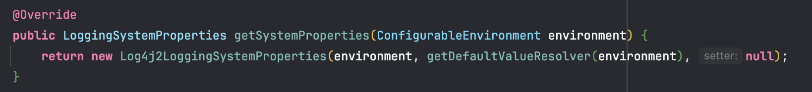이제 이전 글에서 확인했던 진입점이다. 첫 번째로 LoggingSystemProperties를 호출하는 지점인데, 여기서는 실제로 구현체에 따라서 LogbackLoggingSystem을 사용할지, Log4J2LoggingSystem을 사용할지 지정한다.