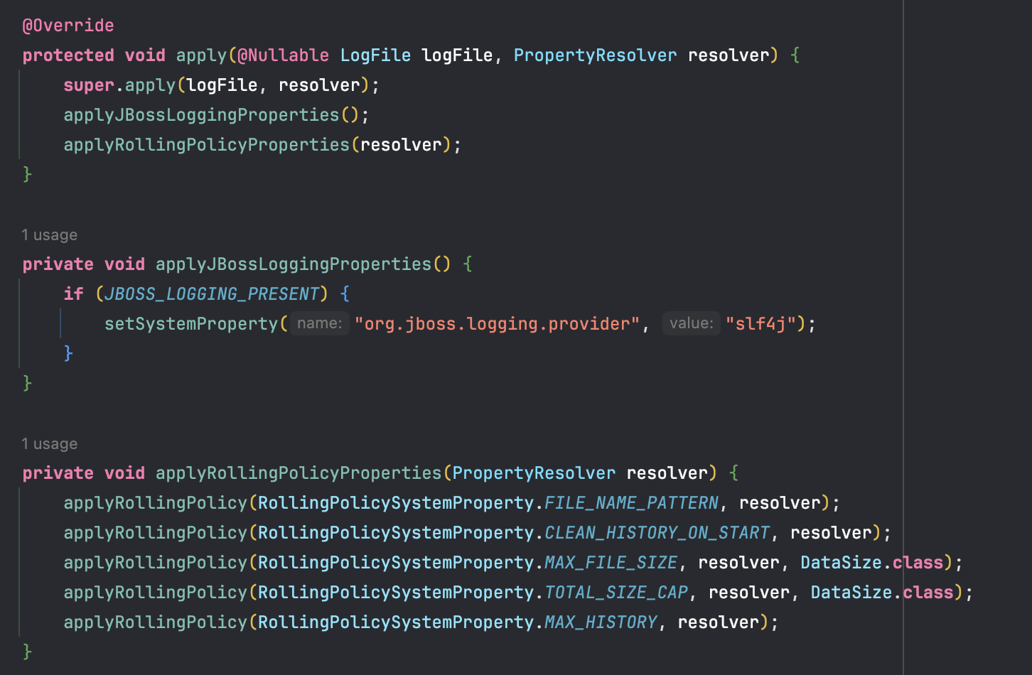 이제 추가한 속성들을 시스템 프로퍼티로 작성해주어야 한다. 기존에는 LoggingSystemProperties의 apply()가 진입점 역할을 해주었으니 해당 클래스를 상속받아 apply에 끼워넣어주는 Log4j2LoggingSystemProperties 클래스를 만들어주었다.