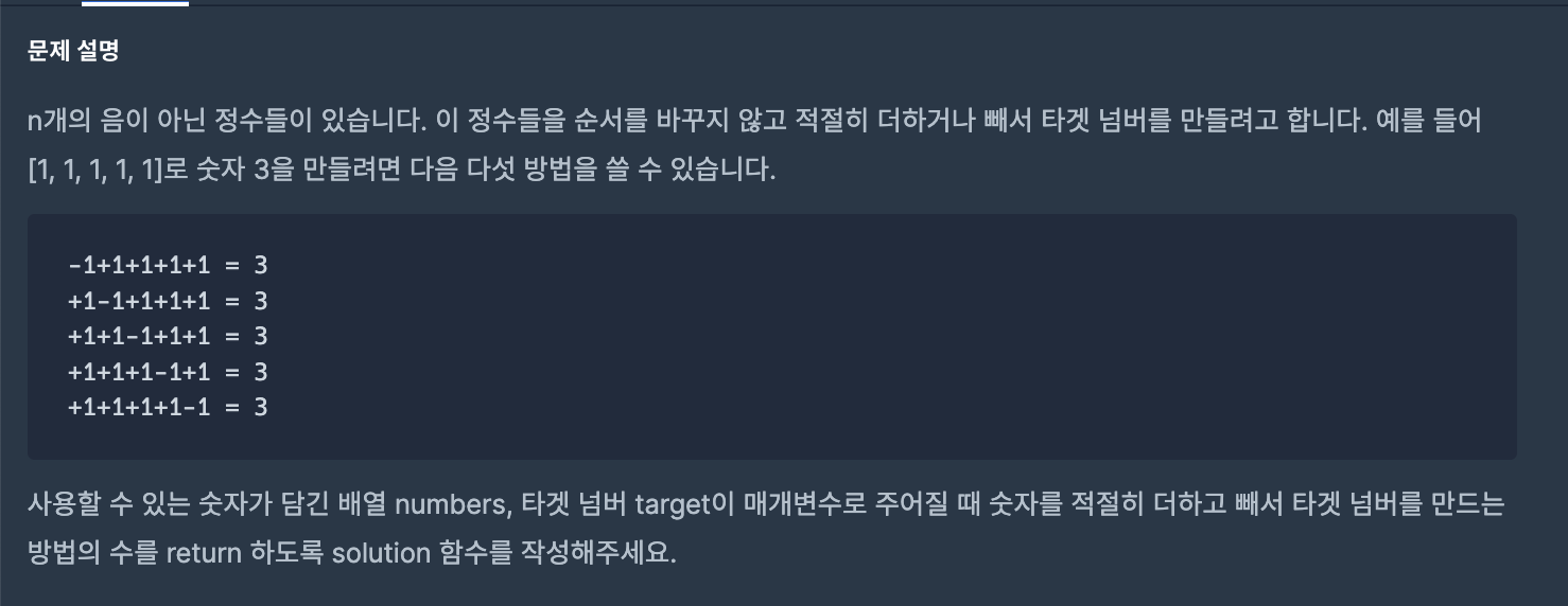 처음 문제를 봤을 때 dp와 dfs가 생각났다. 먼저 dfs 풀이는 각 숫자마다 -, + 두 가지 경우의 수를 모두 탐색하면서 내려가는 경우이다. 내려가면서 남은 모든 수를 더하거나 뺐을 때 목표 숫자가 나오지 않는다면 가지치기해주어서 최적화해줄 수 있다.