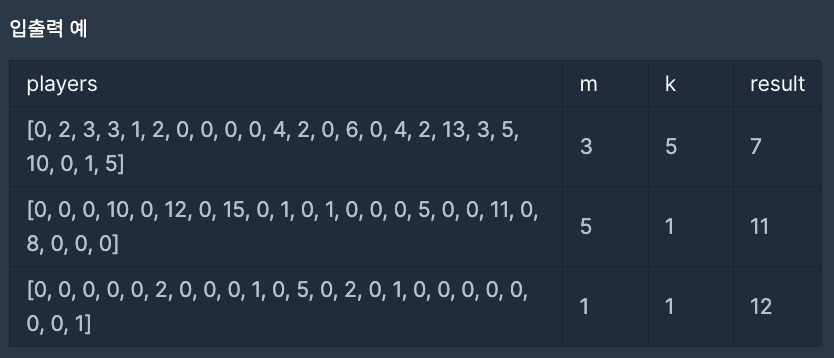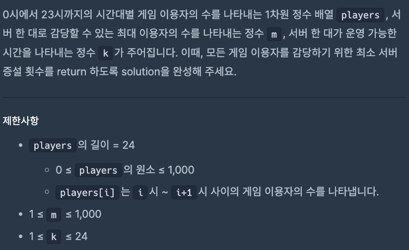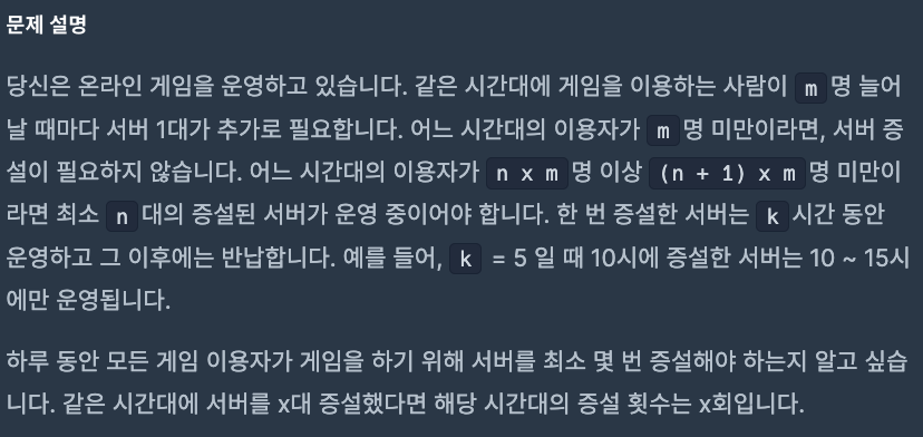 별다른 알고리즘적 사고가 필요하다기보단 구현을 확인하는 문제인 것 같다. 현재 활성화된 서버를 트래킹하고 필요한만큼 추가해서 24시간 내에 몇 번이나 증설되었는지 구해주었다.